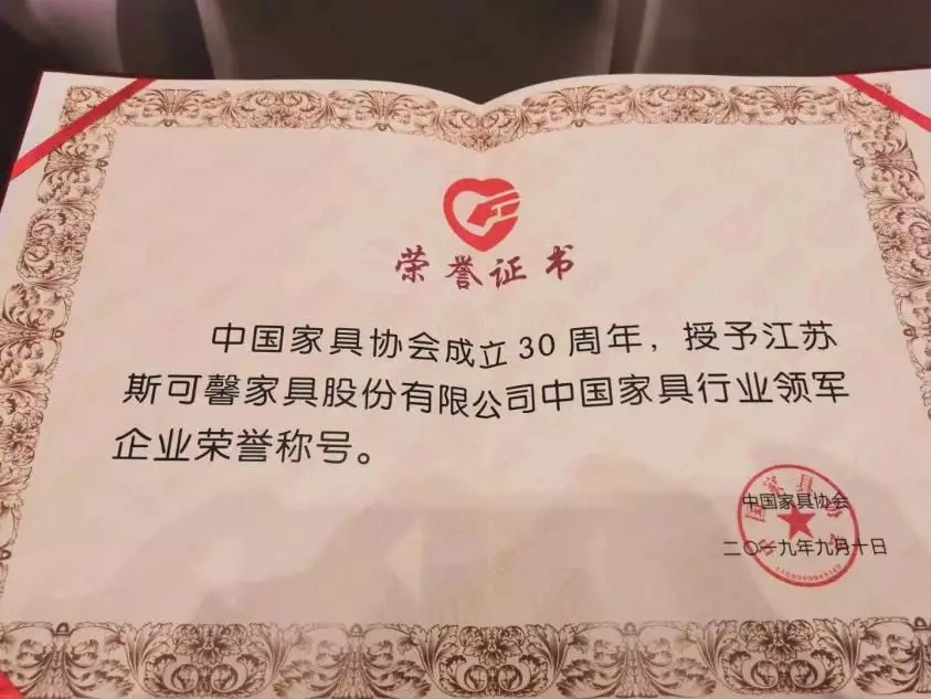 中國家具行業(yè)領軍企業(yè)榮譽稱號