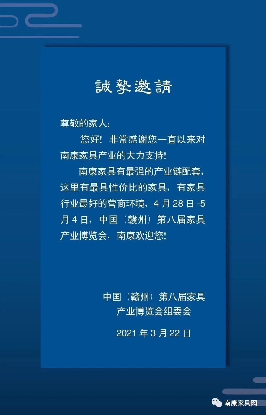 盛啟!2021年南康第八屆家具產(chǎn)業(yè)博覽會(huì)邀請(qǐng)函!